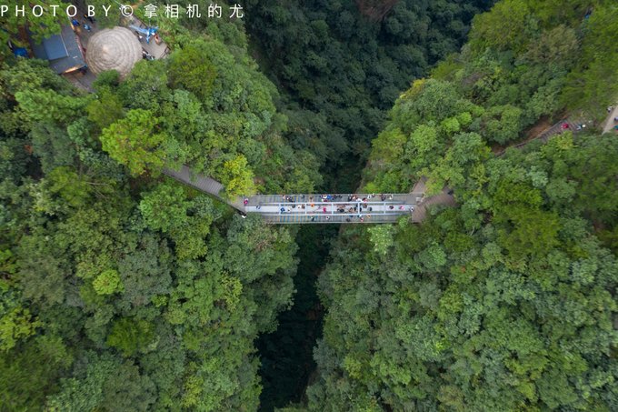 远处的天下第一桥,横跨在两山之间,它是世界上迄今为止所发现的垂直高差最大的天然自生石板桥。