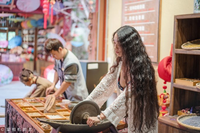 做香囊:香囊根据不同的功效,用不同的花草配方碾磨而成。体验是免费的,如果想带走自己亲手做的香囊也只要35元。