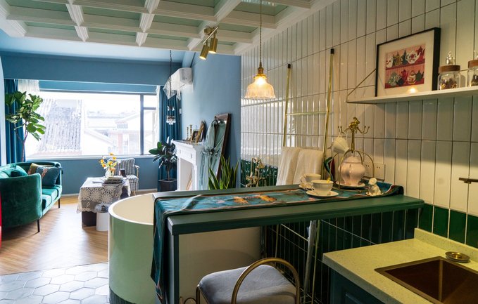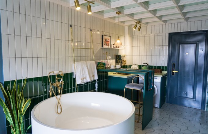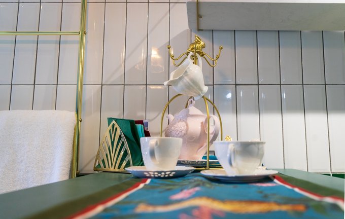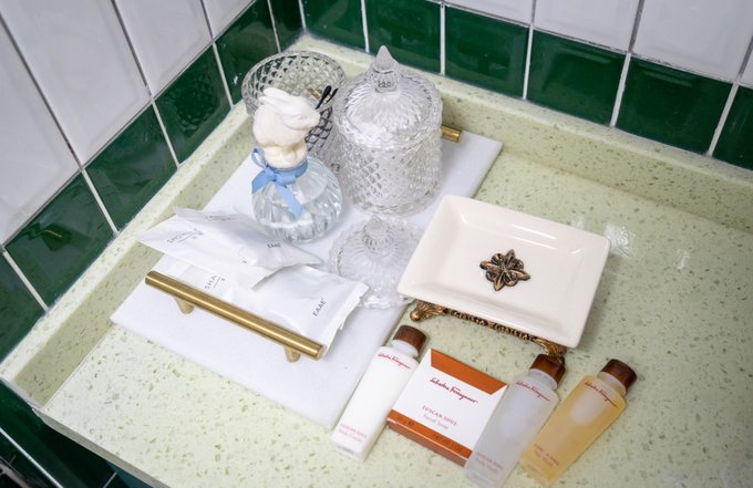 最爱当然是复古的装修风格。墨绿色和金色的大量使用,再加入一点点红,颜色就超复古。陈设和餐具多用黄铜,是近年很时髦的元素,一看便知,民宿老板品味不俗。