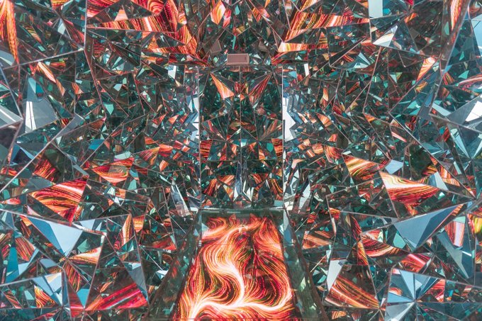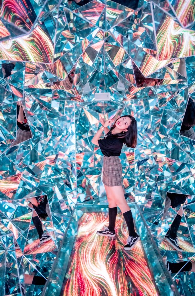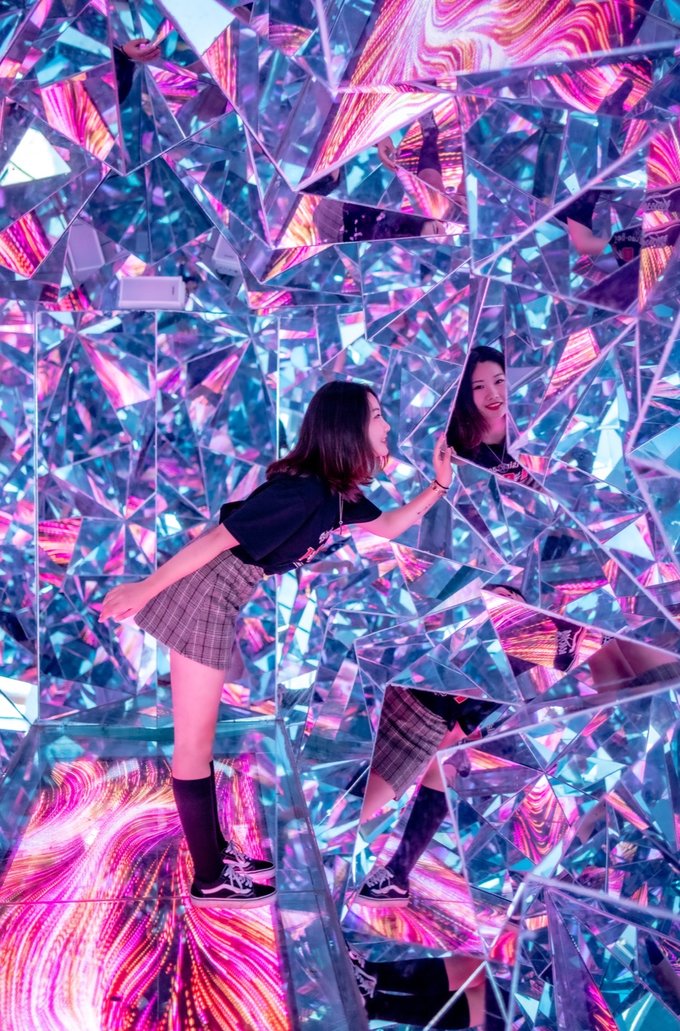 被眼前的超大屏幕和头顶的白色屏幕包裹,身临其境的体会大自然的神奇。 前面游览过程中,对地质运动的似懂非懂,于这幕后也有了更深刻的认识。这样生动有趣的形式,必定能带给更多游客,关于地质的好奇与感染。 看完短片,去博物馆二楼的互动区转一转,又是新的发现。 互动区设置的水晶世界、万花筒,光线变幻莫测,blingbling特别亮眼。