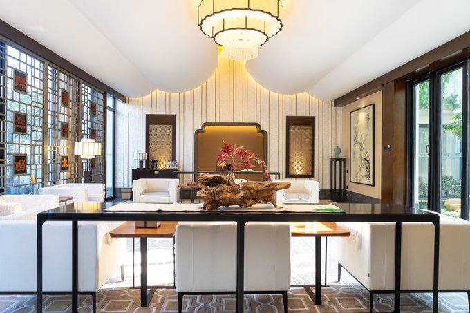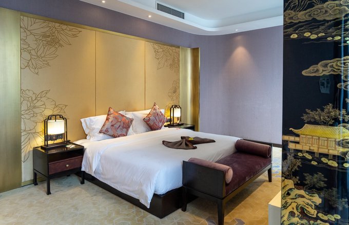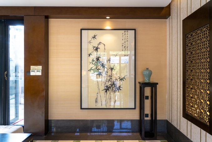 房间共有2层。一楼主卧、会客室、客房、保镖房、娱乐房等,二楼还有一间客房。整套房子可以容纳8人入住,容量也是够大了。房间也是中式风格,设施一应俱全,十分贴心。立柱上的运河画作、中式屏风,都为房间添了一份景致。