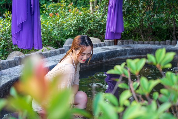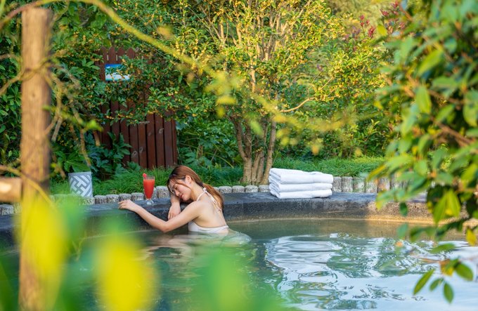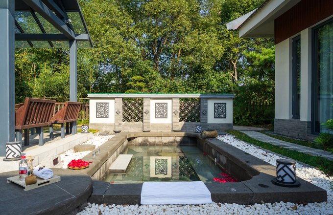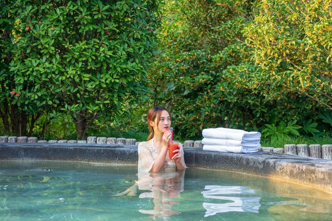 由大堂出门,经由曲折的户外道路去客房,路途上满是桂花的甜香,熏得人心醉。 入住的赐花殿独门独院,开门最显眼就是铺满玫瑰花瓣的温泉池。将大门一关,便是一个私密的世界,急忙换上泳衣,泡进温泉池中。水温刚刚好,泡了没多会儿就感觉全身上下冒着热气,从内到外舒展开来。 夜晚时,抬头数着星星浸在温泉池中,想必又是另一种幸福的体验吧。