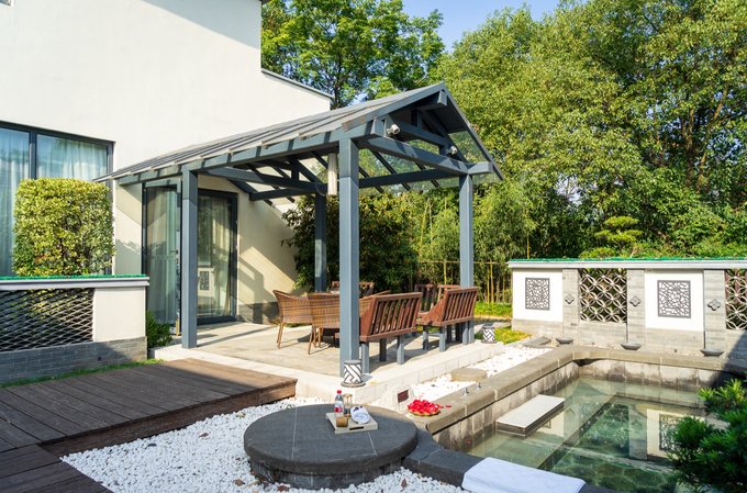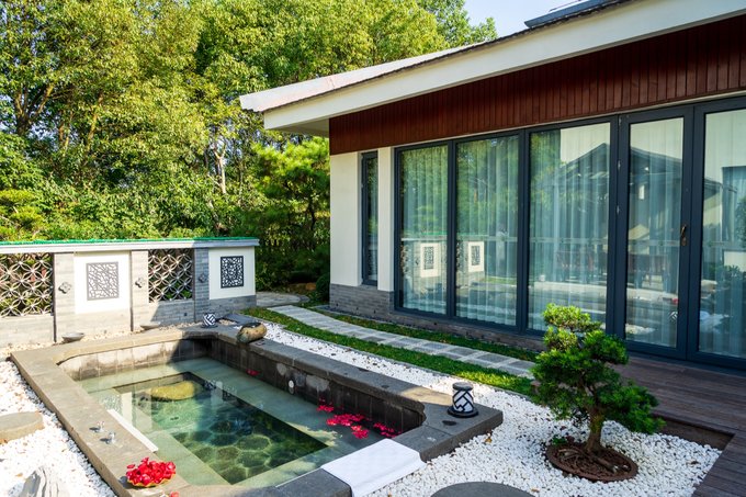 从温泉池中恋恋不舍的出来,才注意周围的环境,也是绿意青葱,颇有生气。淡淡的中式风设计,不多不少的极简风,都让人心生好感。