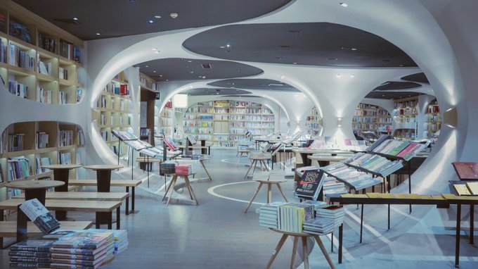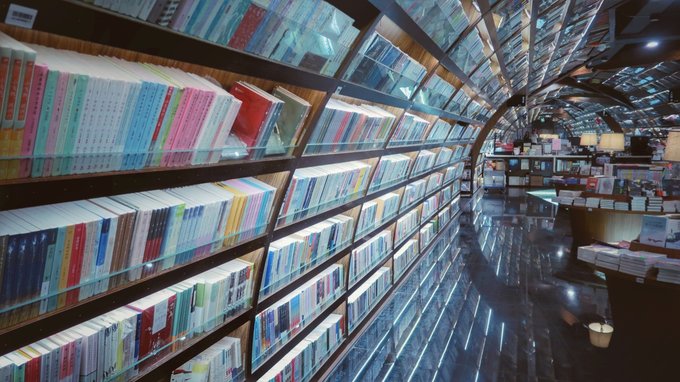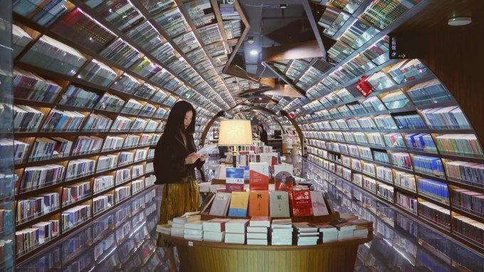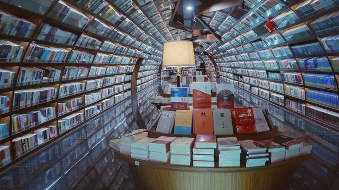总觉旅途中,最幸福就是遇到一家合眼缘的书店,捕捉旅途中一缕书香。毕竟眼前的风景再壮观,再美好,总觉心里空落落,偶遇书店一间,即便匆匆翻几页,也觉心里踏实。 这家钟书阁,算是慕名而来,朋友圈里见许多摄影师朋友发过,一眼瞧去设计感、科技感满满。以往见过书店虽多,多时文艺极简风,科技风还真是少遇。 书店开在珍园旁,进门宛如跨进一个长长的时空隧道,密密麻麻的书籍,整整齐齐的排列在两侧和头顶,形成一个大大的拱形。