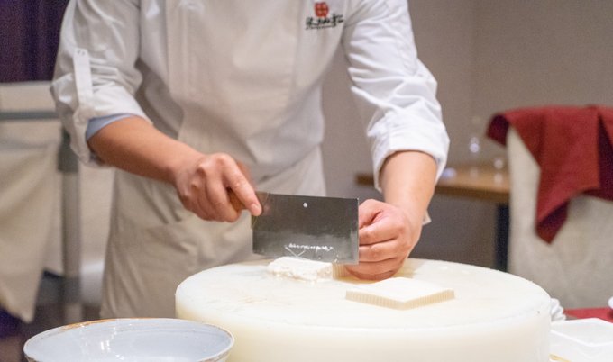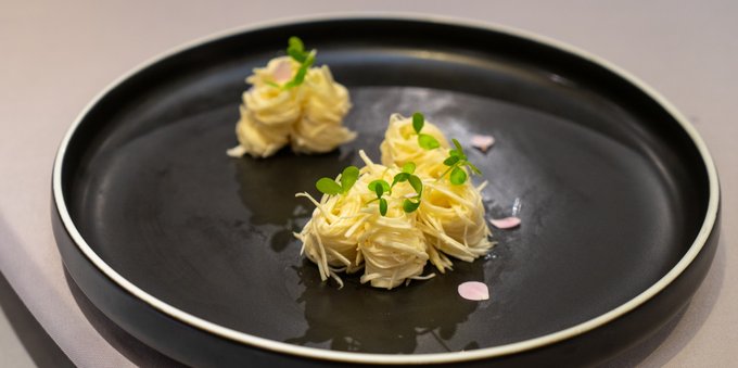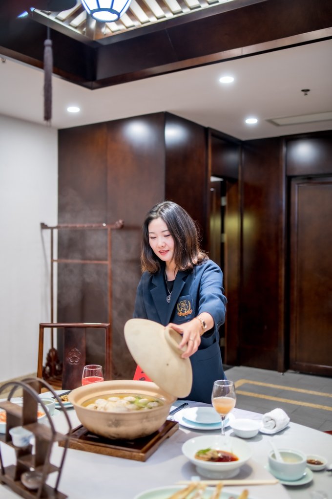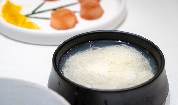 更具心思的是这文思豆腐。厨师将整块豆腐直接搬到桌前,现场演示这道菜的制作。 淮扬菜本就极注重刀工精细,可将软软的豆腐切成丝状还不断,一定是多年的刀工基础才行。