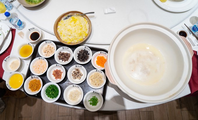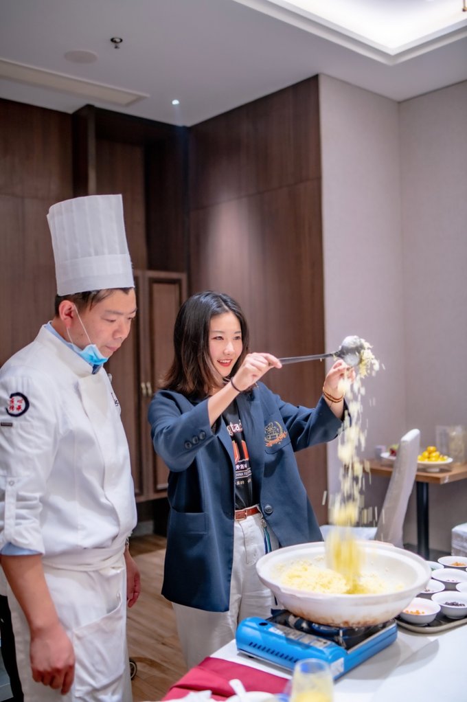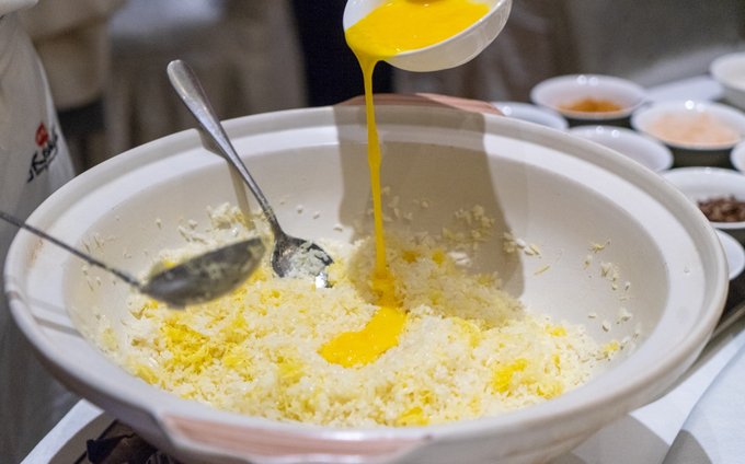 最后是名声在外的 扬州 炒饭。虽说声名远播,在这座城也是随处可见,但是正不正宗另说,现场炒制扬州 炒饭也是第一回见。 给力的大厨又把做炒饭的食材搬上桌,粗看就有10几种,肉丝、鲜虾、鸡蛋、木耳……米饭一定要用隔夜饭。把食材按照步骤加进去,大厨的每一个步骤都像在创造一件艺术品。