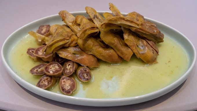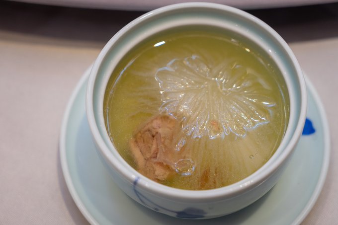 成丝之后,浸入汤中,成一道豆腐羹,豆腐丝婉若游龙,轻盈好看,尝来口味清新雅致,回味无穷。本是几毛钱一块的豆腐,经厨师的巧手,做成几十块一客的菜品。即便是普通的食材,也能做到极致,在禧狮楼受教了。