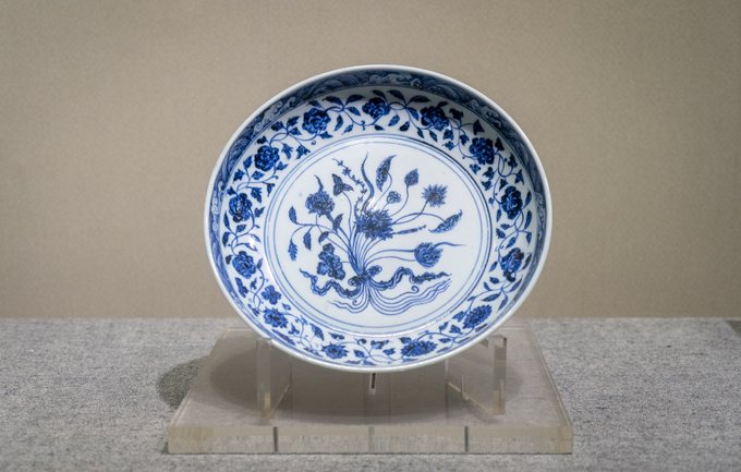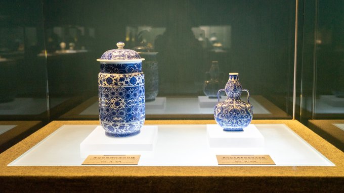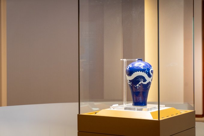 首先必要说这件国宝厅中的“镇馆之宝”——元霁蓝釉白龙纹梅瓶。该梅瓶属于元代 景德镇 窑蓝釉瓷器中的大型器物,代表着元代 景德镇 窑的最高烧造水准。这种梅瓶目前传世仅见三件,一件为宫廷旧藏,现存颐和园,一件藏于 法国 巴黎 吉美博物馆,两瓶都有残损,只有 扬州 双博馆的这件器型最大、纹饰最为精美,1992年更是被国家文物鉴定委员会评定为国宝级文物。