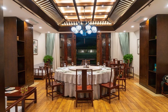 就餐的包间满满的中式古典风,服务员介绍,前一晚“皇阿玛”张铁林一行就是在这个包间就餐,哈哈于是跟小伙伴互开玩笑,我们这也算是皇家待遇了吧。 服务员介绍才知,包间的后门可以打开,背后便是进门时的亭台楼阁,眼前豁然开朗。
