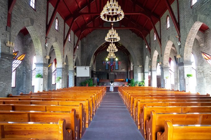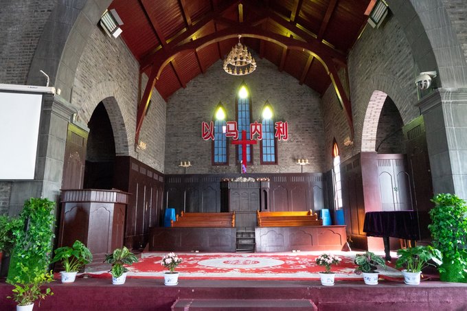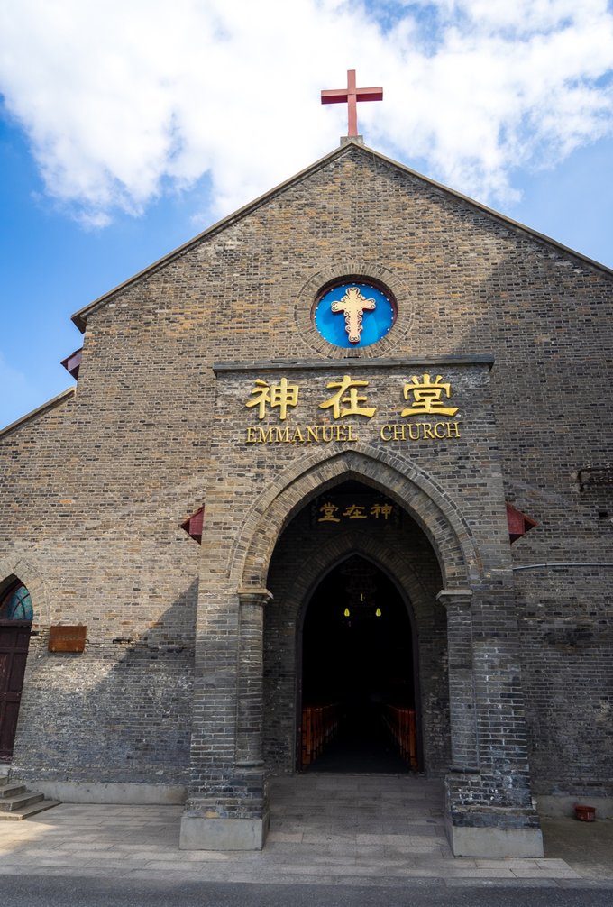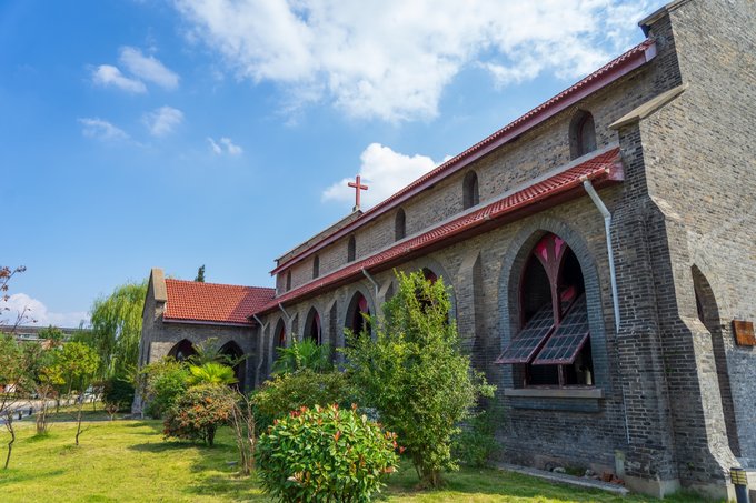 ——东关街旁的哥特式教堂 在东关街附近遛弯儿,偶遇这座基督教神在堂。由 美国 圣公会会长韩忭明于1924年兴建在美 汉中 学内,可供600人聚会礼拜。 建在绿茵茵的草坪之上的古旧色调,加之这蓝天白云,有种反差美。忍不住进去看一看。