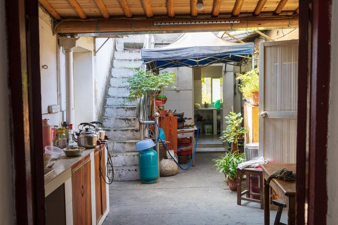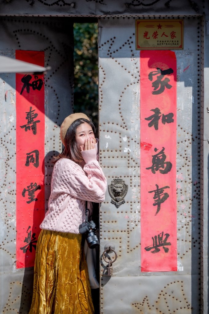 东关街上的原住民并没有强制迁出,如今街头巷尾依旧能见到许多百年老宅子,跟世世代代居于此的居民。青石色的房屋很有历史的痕迹,门口的对联更是多了生活的气息。