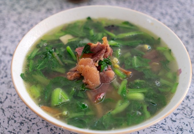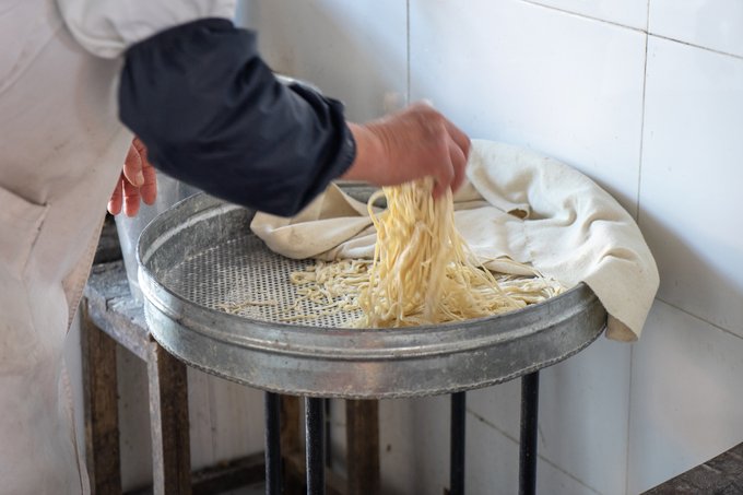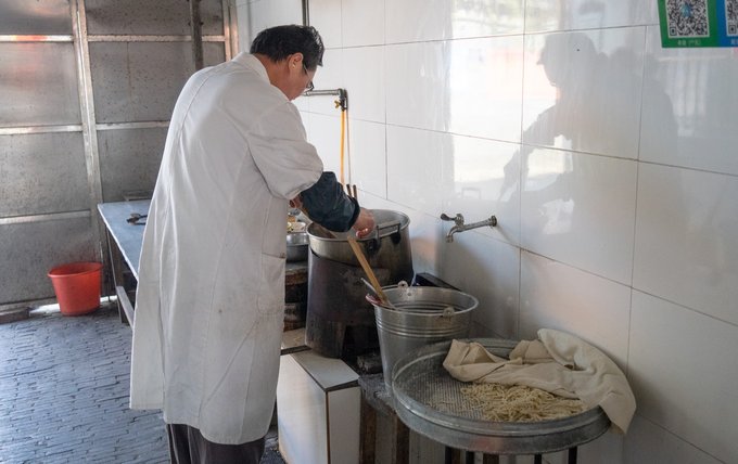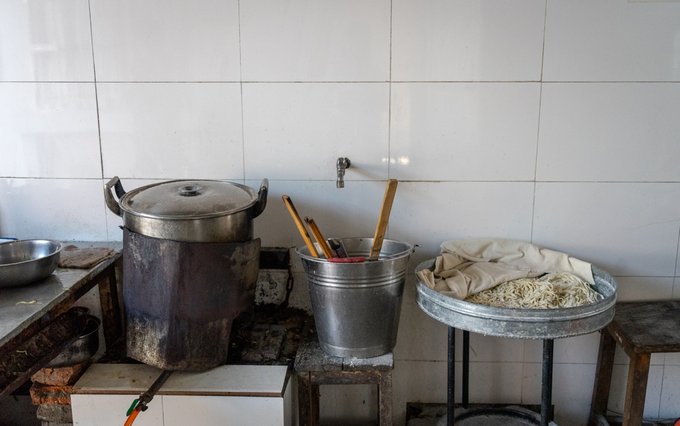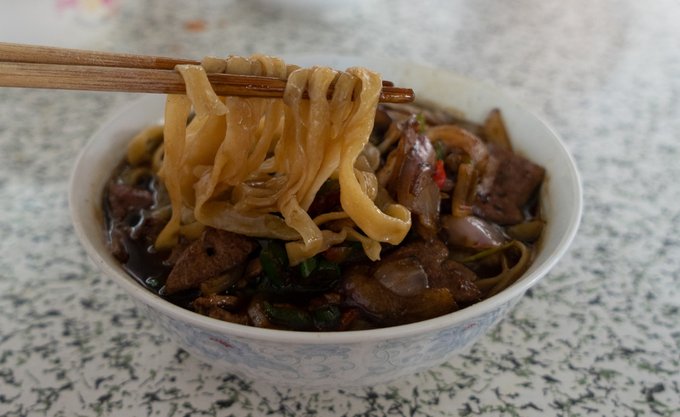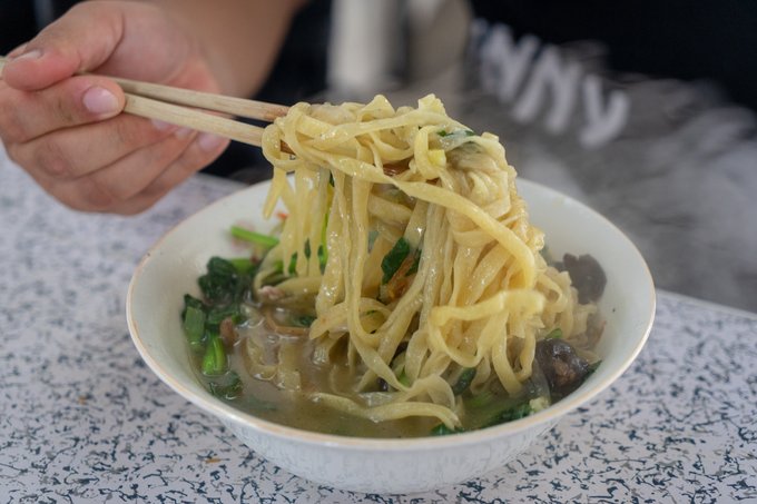 擀面,煮面都在室外,看来十分家常,想着这面味道就该不错。做面的大叔话很少,旁边还有个阿姨负责倒汤头,不知道是不是夫妻店。