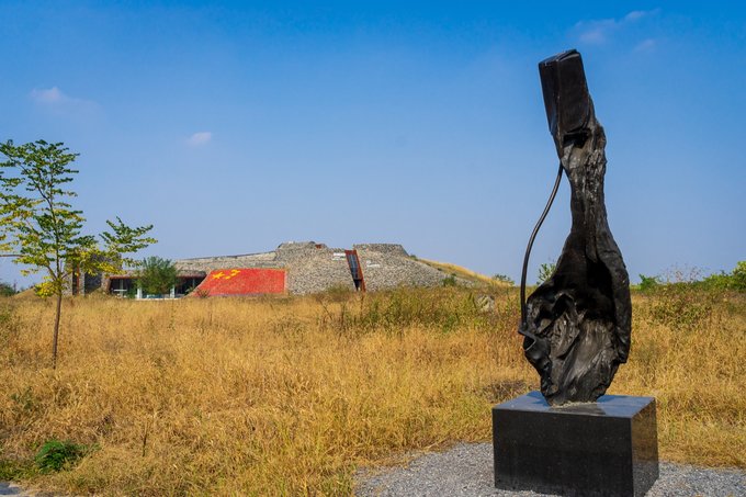 博物馆的外观也很大气壮观,颜色不一、形态不一的砾石堆砌,一面红旗用暖色调点亮。隔着秋日的黄草地,是与地质公园门前建筑同一设计师的作品,颇具历史与岁月的沧桑感。