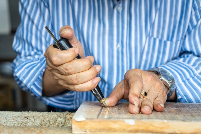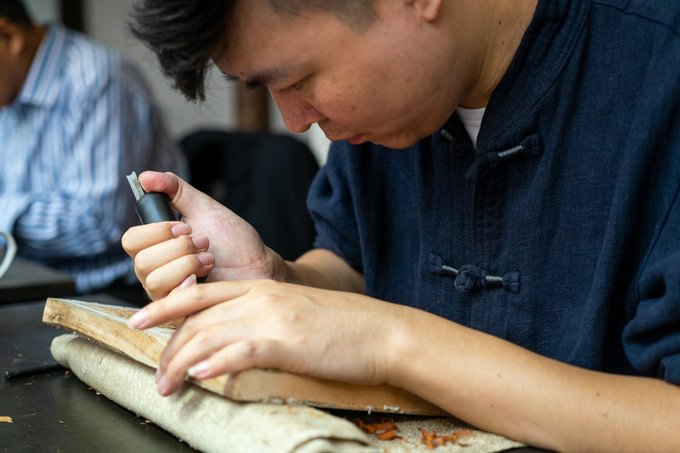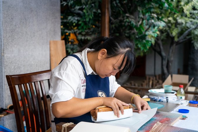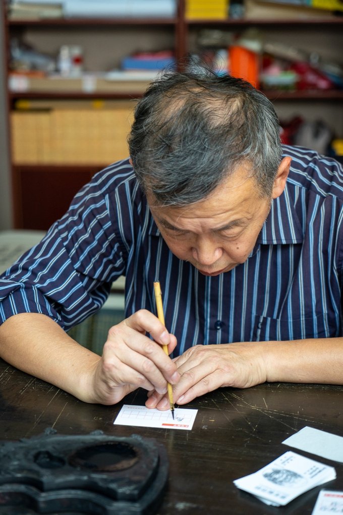 在博物馆的互动区,有幸亲眼见到了雕版印刷的全过程,现场的艺术家大师们,专心致志的忙着手上的工作,游客怎样喧闹都不以为意,这样的专注实在担得起“匠人精神”这四个字。 先是在一定厚度的平滑的木板上,粘贴上抄写工整的书稿,薄而近乎透明的稿纸正面和木板相贴,字就成了反体,笔划清晰可辨。 接着雕刻工人用刻刀把版面没有字迹的部分削去,就成了字体凸出的阳文。印刷的时候,在凸起的字体上涂上墨汁,然后把纸覆在它的上面,轻轻拂拭纸背,字迹就留在纸上了。