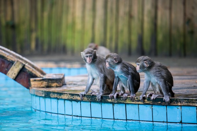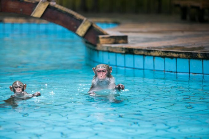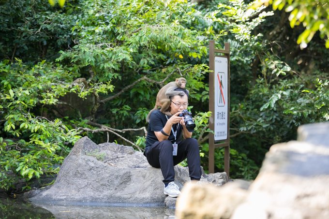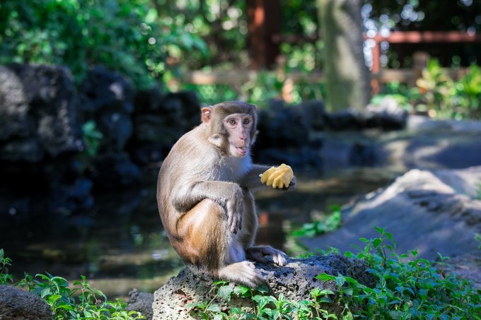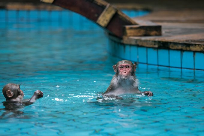 再往里走还能看到猕猴的沐浴胜地,也就是浴圣池,是岛上的五星级涂池,这里是是小猴们天热时最佳的休闲健身场所,沙滩椅、遮阳伞一应俱全。