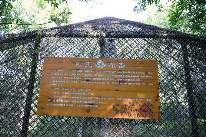 继续往前游览就到猴岛游览路线的最高点,也就是观猴亭。在这里可以看到齐天大圣孙悟空的故居——水帘洞、猴岛、猴趣等具有独特标记的景观,大家可以在上面拍照留念。