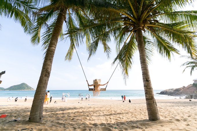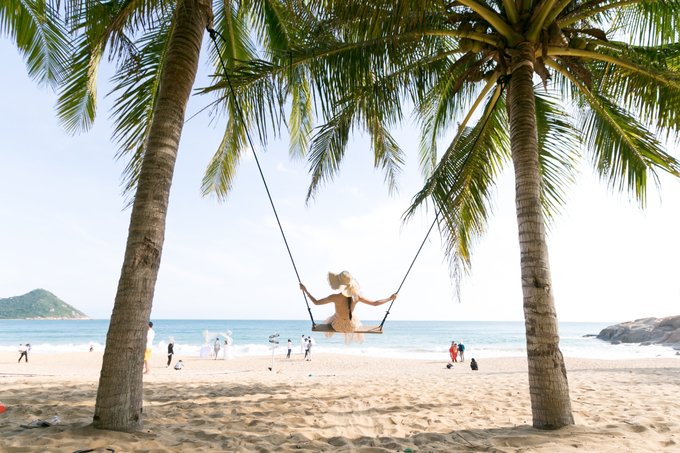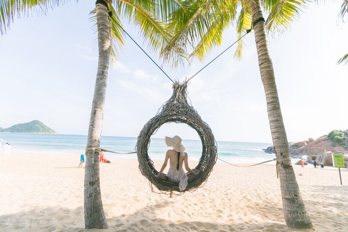 海岸边不少椰子树,有网红鸟巢造型和网红秋千,坐在秋千上,懒散的摇动着,海风不断吹过发梢,无不让人沉醉在这片精美的沙滩上。 我脑海中的“椰风海韵”描绘的大抵就是这幅模样,岁月静好。