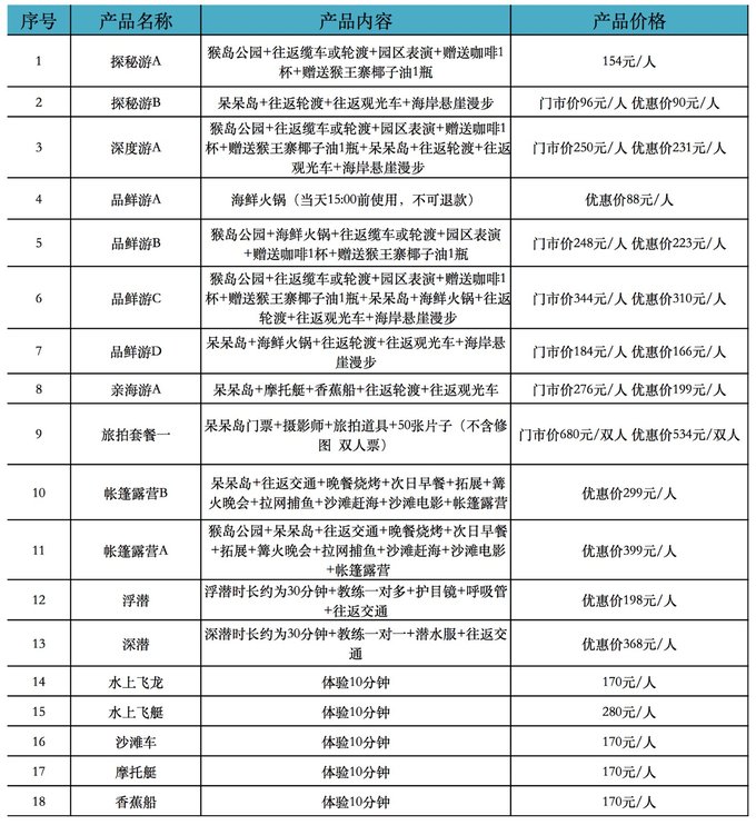 10月28日 中午到达南湾猴岛景区 12:30-13:30猴岛海景酒楼午餐 14:00-17:00 【跨海索道 人猴和谐 趣味猕猴】 17:20-19:30 【呆呆岛最美沿海公路 】 10月29日 9:00-10:00 呆呆岛沙滩趣味拓展项目 10:30-11:30 呆呆岛沙滩车 12:00-13:00 呆呆岛海鲜火锅 14:00-15:30 呆呆岛网红打卡拍摄 18:30-19:30 沙滩烧烤晚宴 20:00 -20:30 篝火晚会 21:30 帐篷露营 10月30日 9:00-12:00 呆呆岛体验潜水、1号滩水上项目体验 下午返程