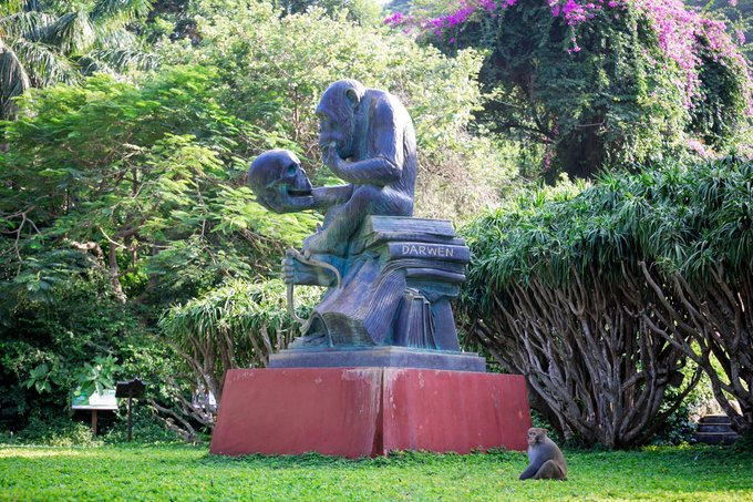 继续往里走,便到了智慧猴雕像,这尊雕像是美国红色资本家哈默博土送给无产阶级革命家列宁的青银雕像,雕像是一只类人猿坐在达尔文的《物种起源》的书上,凝视着人类的头盖骨,整个雕像的含义是在告诉我们:人类应该学会和平共处,学会遵自然法则。