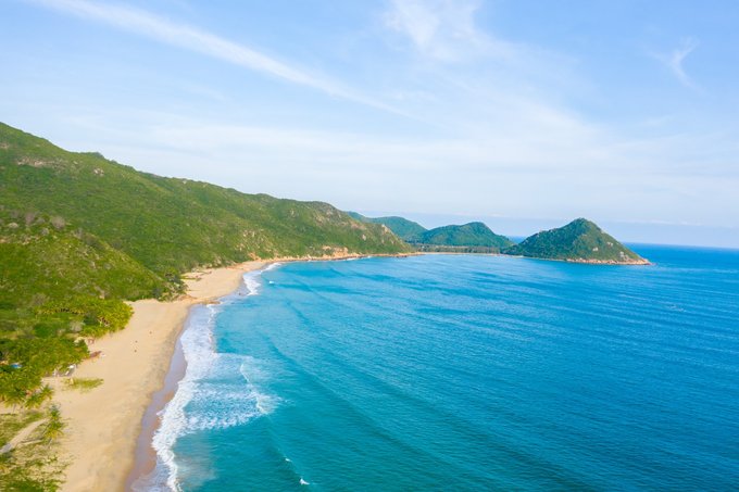 刚踏入这片海滩,映入眼帘的便是绵延起伏的绿山、洁白的沙滩及湛蓝的海水,整个沙滩呈半月形状,据说是这片海域中保护最好的沙滩,非常的原始。
