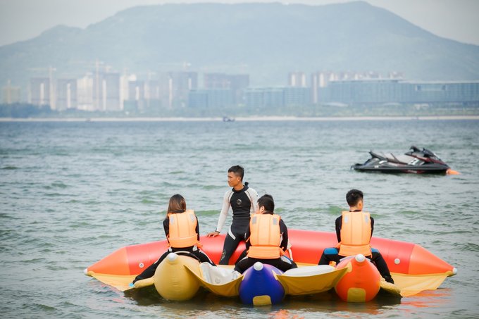 一个类似香蕉型状的橡胶皮筏因而得名为“香蕉船”,坐在香蕉上由一艘快艇约以50公里/小时的时速。香蕉船非常的惊险刺激,如果有这种体验千万不要错过。