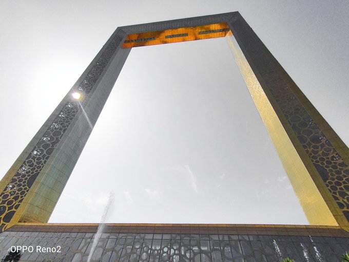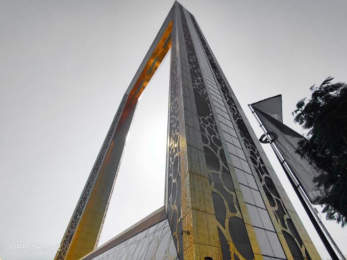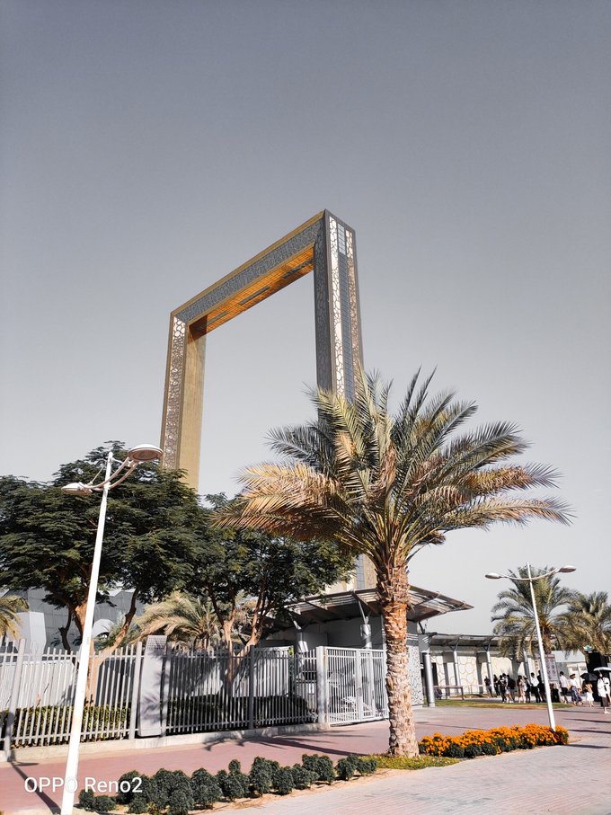 迪拜相框 它最新加入豪华建筑套餐。披着24K金的外衣,可以把你送到150米的高空俯瞰城市,在这里随便拍张照都是豪气的大片。