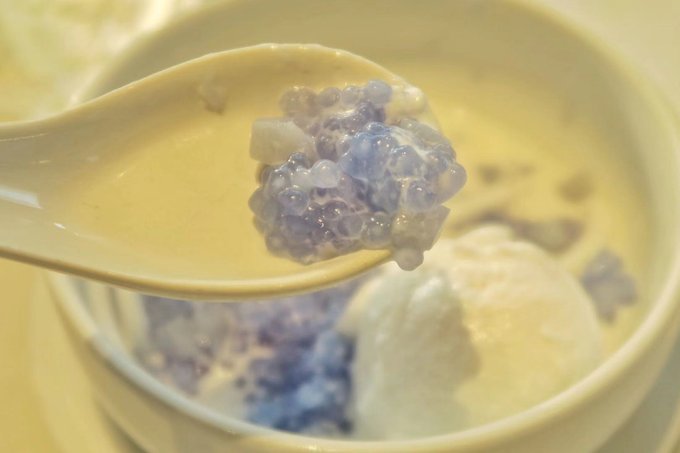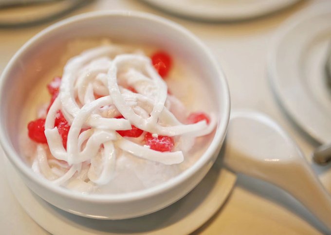 点了几个甜品。每一个的口味都很好。最爱的就是这个,红色的里面是荸荠,白色的是椰肉条,里面还有椰奶,吃起来口感清脆还有浓浓的椰奶的香味。