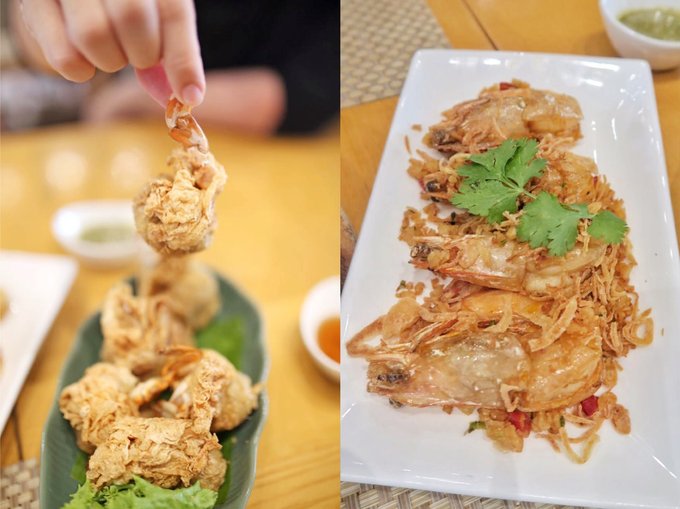 油炸蟹肉,长得跟福袋很像,里面蟹肉很多,而且不用剥壳,简直是女生的福音。360泰铢。 炒海虾,外皮香酥,里面肉质却又鲜嫩,蘸上酱汁,味道好极了。