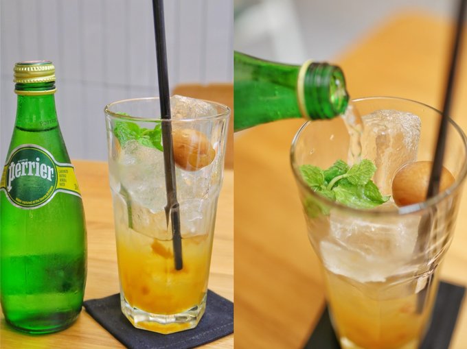酸梅汁真的很“酸爽”,里面有酸梅的果肉,喝的时候再倒上巴黎水,在炎炎烈日的曼谷给人一丝清凉。