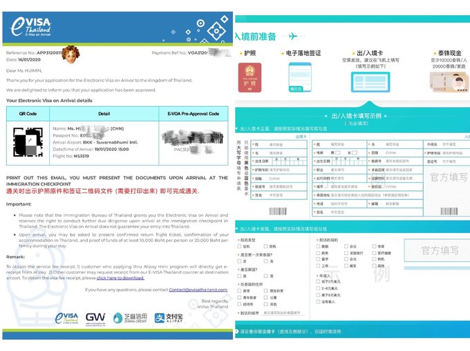 关于行程 DAY1(1月19日):河北航空NS3519石家庄→连云港;连云港→曼谷,落地曼谷素万那普国际机场是17:00,晚上8点入住酒店 DAY2(1月20日):丹嫩沙多水上集市,美功铁道市场,Gai Hound晚餐 DAY3(1月21日):泰式按摩,Greyhound Cafe午餐下午茶,尚泰百货(CENTRAL@ centralwOrld) DAY4(1月22日):上味泰餐厅(Savoey Seafood),河北航空NS3520曼谷→连云港,连云港→石家庄,凌晨3点半到温暖的家 关于签证 现在泰国的签证我了解到的可分为三种:落地签,贴纸签,电子落地签。 落地签2020年4月30日前免费,停留时间15天。但是排队的人超级超级长,我选择的是电子落地签,提前3天办理,需要2寸白底照片,往返机票行程单,酒店预订信息,护照信息即可,如果不知道准备什么样的材料可以随时问客服。服务费是530泰铢(人民币123元),直接支fu宝就支付了。审核超级超级快,我是16点申请的,19点就给我发短信说通过了! 然后出发前把文件打印出来,通关的时候拿上护照和打印出来的电子落地签即可。不过电子落地签只有素万那普国际机场,廊曼国际机场,清迈国际机场,普吉国际机场4个机场可以用。电子落地签非常方便,节约时间。到了机场找到电子落地签的窗口,会有一个工作人员把你带进去,不用在外面排队。相当于vip的待遇咯~