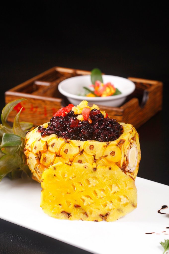 菠萝为盅,米饭填充,不同颜色的层叠,让人更有食欲。
