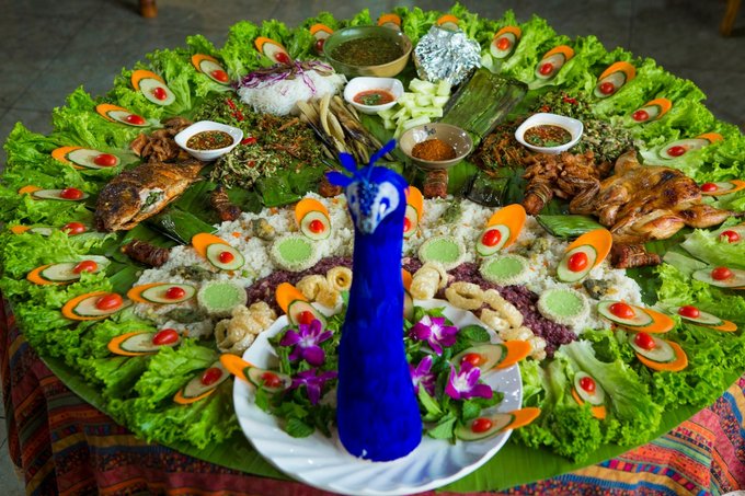 不用筷子不用碗,直接用手抓来吃,粘上酱汁的菜与饭,酸辣甜咸香,回味无穷。 也有人用孔雀头模型作点缀,把菜品装饰成开屏的孔雀,更有一番民族风情。