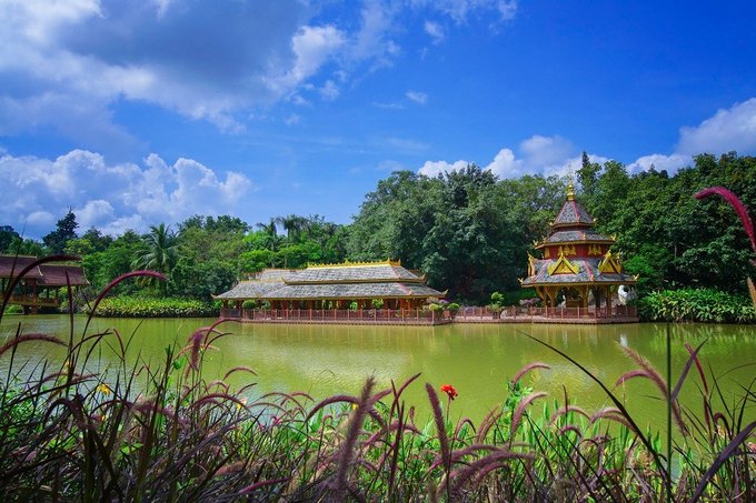 这里是民族历史博物馆,也是难得一寻的世外桃源。幢幢精巧别致的傣家竹楼和佛寺古塔掩映在绿树丛中,香蕉、荔枝、椰子树环绕周边,远观近看都是不同体验。