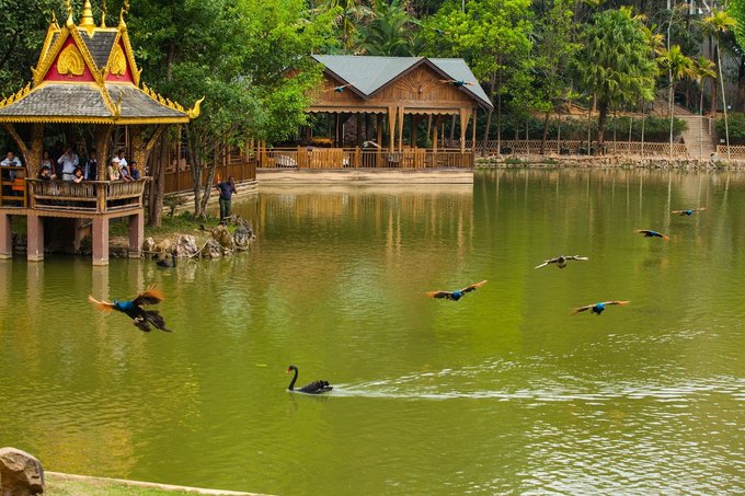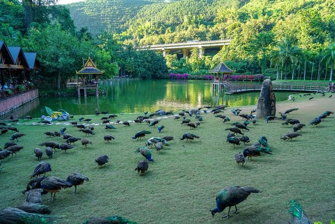 穿过树林,走进孔雀山庄,上百只孔雀生活在这里,每隔1小时,它们就会在这里翩翩起舞。当翅膀在空中舞出优美的弧线,当脚掌激起粼粼的湖光,按下快门,百鸟齐飞,尽在记忆中。