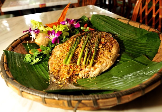 这是傣家人款待贵宾必不可少的一道菜。剖开鱼腹,放入葱姜蒜的作料,用香茅草再捆好鱼,用竹片夹紧,放在火炭上烘烤。