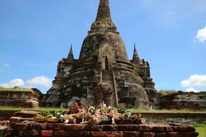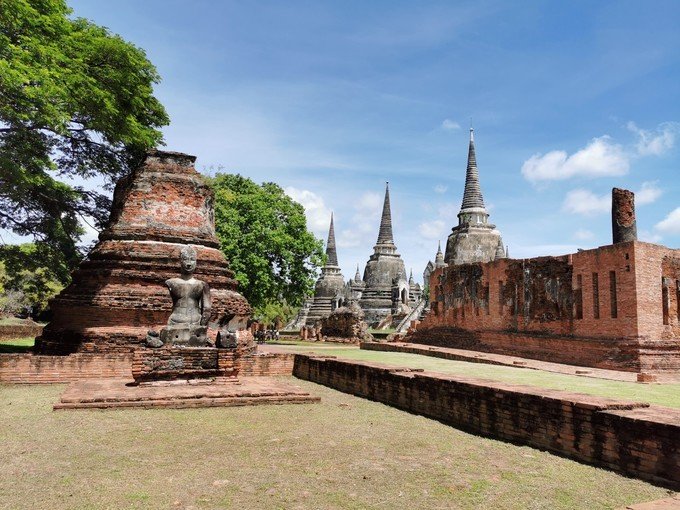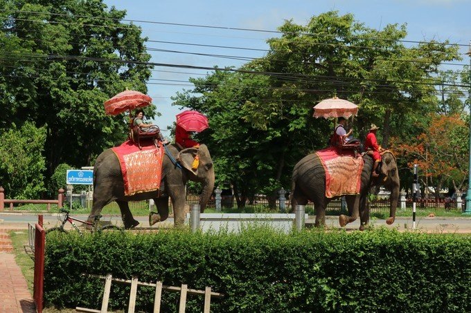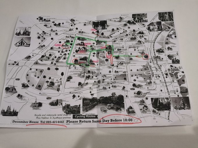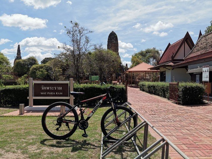 阿育塔亚到啦! 车站出口有很多突突车司机,有钱的可以找他们带你转,毕竟不需要自己费心思看导航了。 我嘛,这次就是想来点不一样的,于是,硬是选择了最累的方式,骑车! 出了站,到马路对面,花5铢坐船过河,上了岸就有租车的地方。直接选了变速车,护照复印,交钱100铢,拍下锁的密码,上车走人。老板很细心的给了我一张地图,可惜,我根本没认真听他讲了什么! 租车的就是这家啦,车就是这样的啦! 然后,我就跟着导航,开始了慢慢骑行路,也一个个的找到了景点!这里建议大家,如果想多去几个景点,确实可以选择220铢的通票,当然,这个票是包含所有6个收费景点在内的,因为其他景点。都。免。费! 最后,其实我只去了4个收费景点,因为另外两个对于骑车来说,真的太远,反正我是受不了高温下骑行半小时以上,有能坚持的可以试试! 具体哪四个呢?我也真的不记得了,因为懒得记,也记不住,实在太热了。索性我就上上图吧,反正基本上该去的除了一个卧佛,其他都去了。 结束一天的行程,下午六点前必须还车。我想坐个小巴士回 曼谷 ,谁知道,离还车的地方还有段距离,于是,又走了回去。70铢,有空调,一个多小时回到 曼谷 乍都乍市场,有劲的还可以继续逛逛乍都乍! 好了,这一天告一段落,回酒店洗澡,现在躺在床上写了人生第一篇游记,希望大家多多包涵!明天飞清迈 ,继续小清新路线