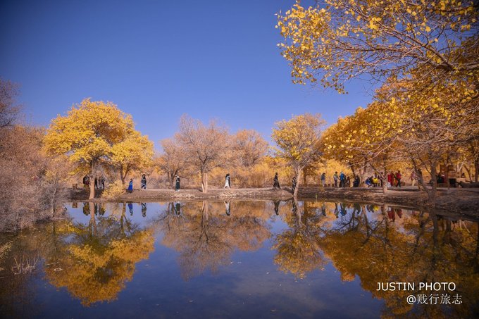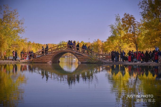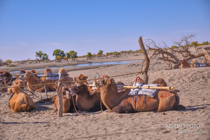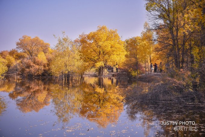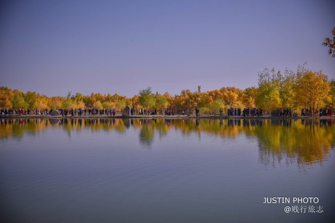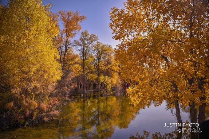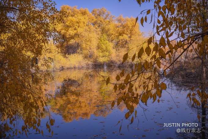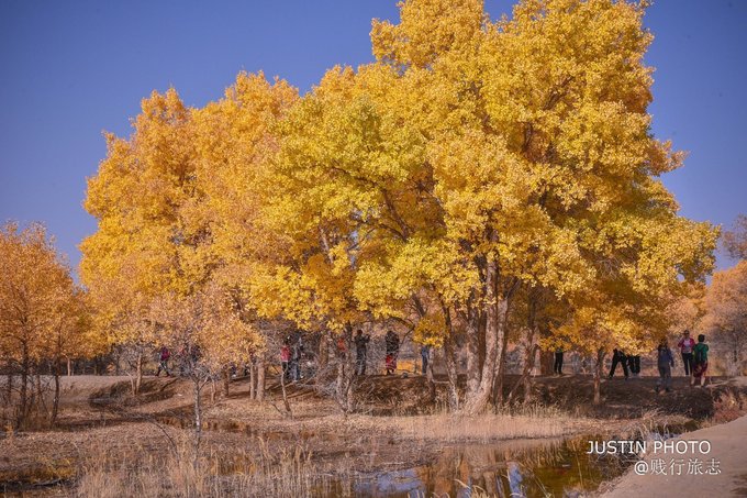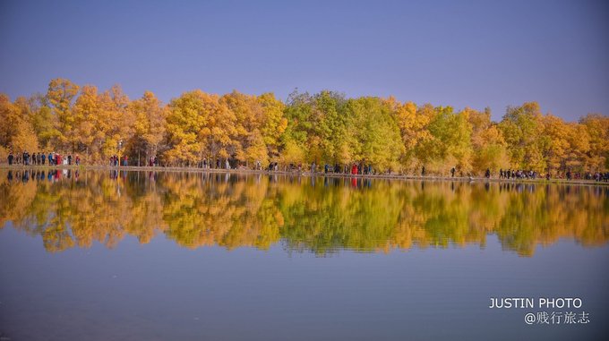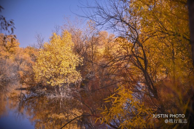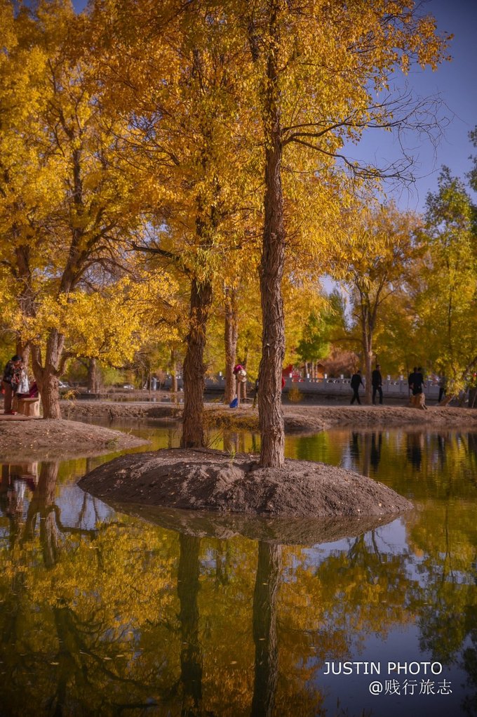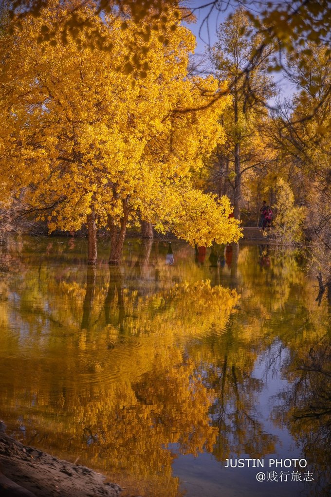 金波湖:穿过长长的胡杨村,终于来到期待已久的金波湖——水上胡杨的观赏地。金黄的倒映在镜子般的湖面,我们收获了2份绝美胡杨林。