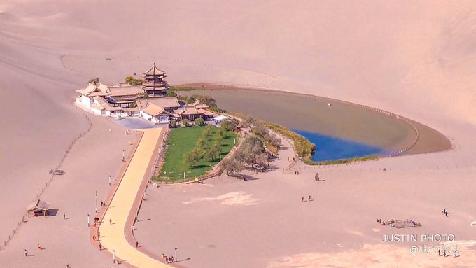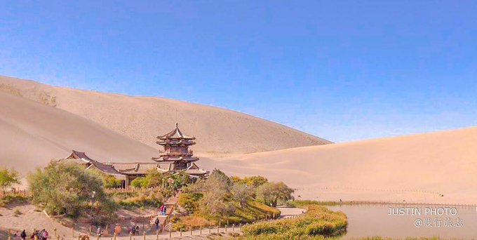 跟鸣沙山齐名还有月牙泉,月牙泉位于鸣沙山脚下,拥有着“沙漠第一泉”的美称,由于形状如月亮,所以很多任把这里称作是沙漠上最美的一轮明月。月牙泉有着“千古不涸”的传说,而且在水面上的水深都比较深,据说月牙泉湖面水深可达9米左右。