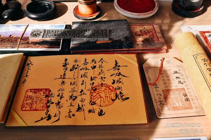 通关文牒就是当时的路证,每路过一个国家,就在上面盖上该国家的印玺,就和今天我们出国时,在海关处盖章一样,在嘉峪关的建筑里,还原了不少当时人们的生活场景,其中就有一个场景,是守城士兵正在查看西域商人的通关文牒。