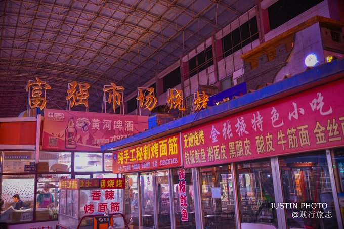 在嘉峪关结束了一天的旅程后,饥肠辘辘的我来到富强夜市觅食。 富强市场发展到今天其实已经演变成了一个以餐饮,只是由当初普通的菜市场演变而又延续到了今天。市场里面有很多 嘉峪关市 的老店,用“富强小吃一条街”命名其实更恰当,卖菜已经成为市场的一个辅助功能。