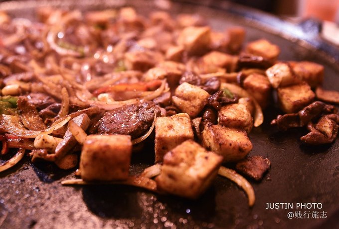 炒拨拉,地方特色的小吃,混合着羊肝、肺、肚、肠,味道十分美味。炒的时候烟熏火燎,吃的时候再加上啤酒那是一个享受。那叫一个美。