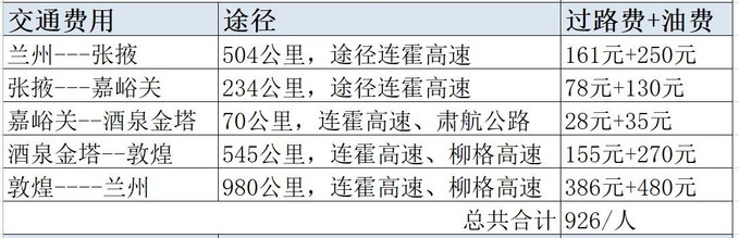 这次行程总共2244公里路,从 兰州 到 张掖 有504km, 张掖 到嘉峪关234km, 张掖 到 酒泉 金塔70km, 酒泉 金塔到 敦煌 545km, 敦煌 返程 兰州 980km,过路费+油费-926元。