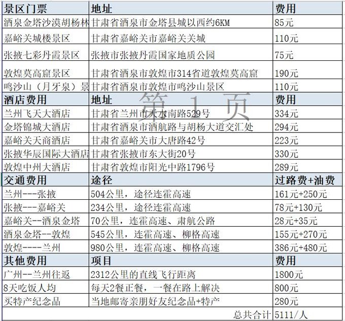 关于这次的行程的全部费用,7天人均花费5111元左右,其中门票费570元,酒店费用是735元,飞机票1800,车过路费和汽油费926元,吃饭等费用1080元,总体来不算是很贵。