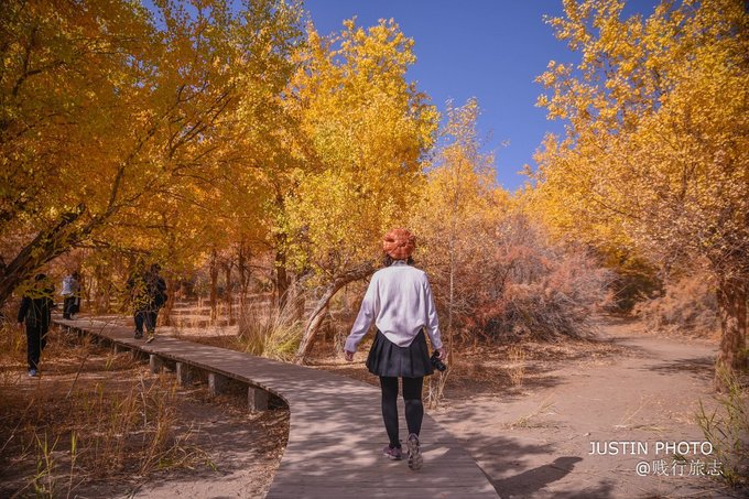 野生胡杨:这里胡杨十分密集地分布在栈道两侧,随手一拍,都能把屏幕占满。干冷的空气在脸上流动着,也不觉得冷,但秋天的气息更加浓郁了。