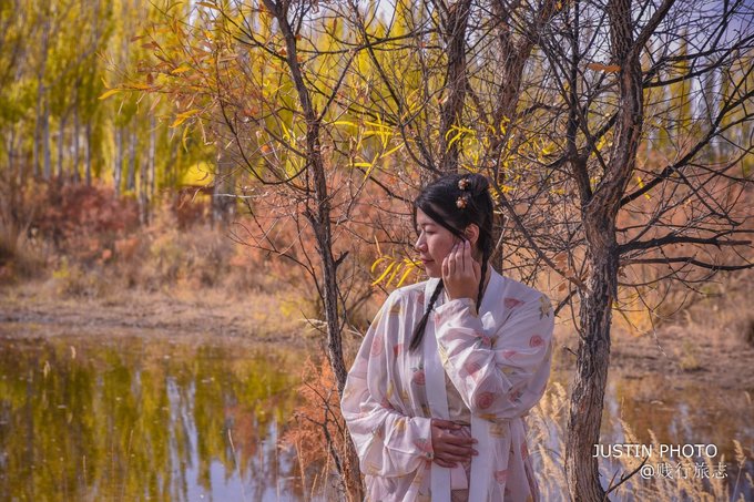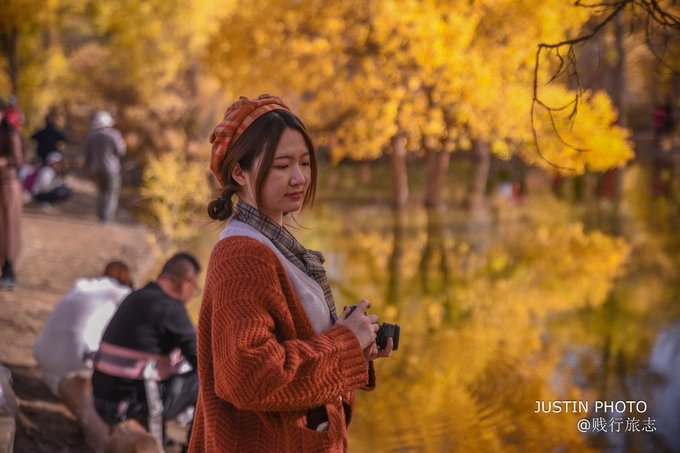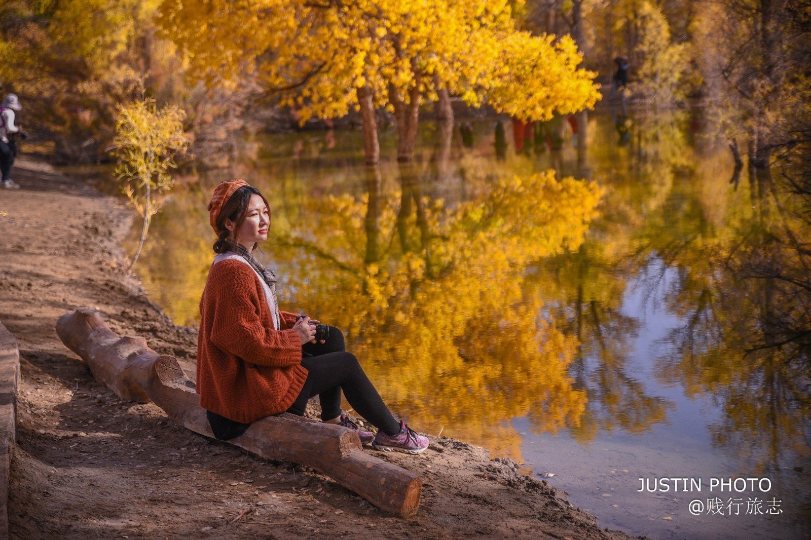 一汪秋水为胡杨林带来了诗意,谁说“自古逢秋悲寂寥”呢,我和刘禹锡一样,深觉秋日胜春朝。这里的胡杨大多呈舒展状态,体态十分优美,因此虽是处于离冬季最近的秋天,却也迸发出一种生机,看着这一片明艳的黄,丝毫不会觉得多么悲伤,反而能让人把不开心的事情都忘记。