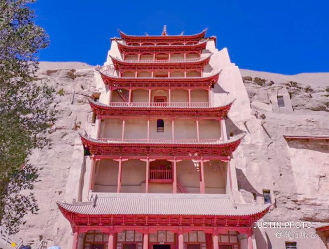 敦煌 莫高窟现存的洞窟有735个,分为5层楼,其中492个石窟存在着壁画和泥塑雕像,整体的壁画面积占据45000平方米,规模非常之大。