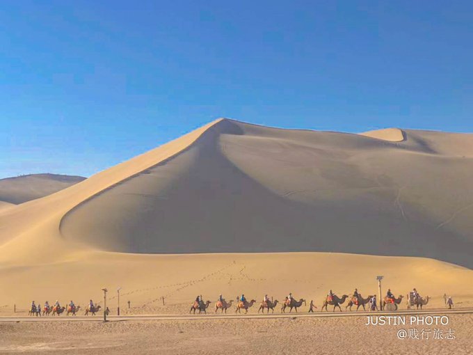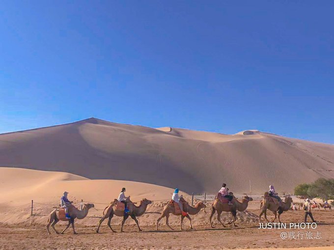 鸣沙山的沙极其细小,光脚踩在上面,你会感觉比沙滩上的细沙还要舒服。虽然在沙丘行走的速度很慢,但是只要骑上骆驼,你就能迅速地从山脚下走上沙丘的顶部,然后俯瞰整个鸣沙山的美景。
