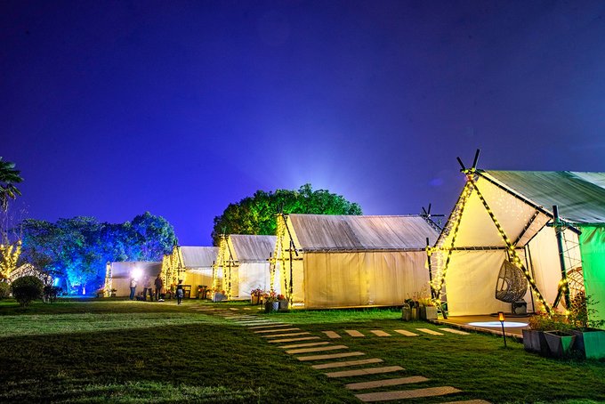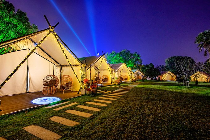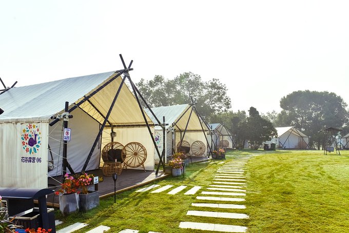 帐篷房位于园区入口左侧,虽说只是帐篷,在布置上却也是颇花了些心思。首先帐篷看起来就带感,一整列搭建在青青草地上,白与绿,还有天空蓝,看着就很舒服。
