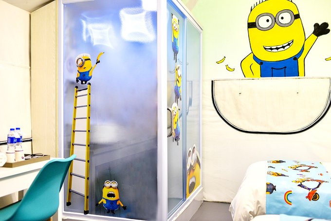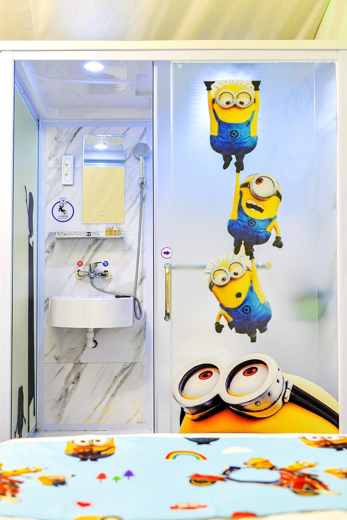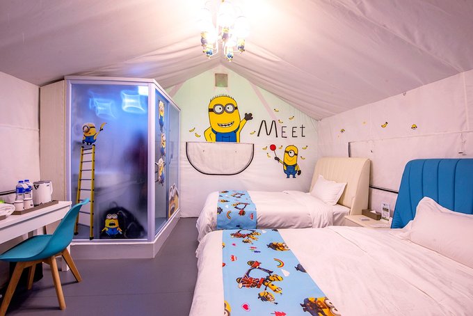帐篷门前布置着秋千和藤椅,帐篷里则有各种主题可供选择,有温馨的,有卡通的,有简约的,我家小姑娘自己选了小黄人主题。拉开门帘,走进帐篷,迎面扑来的可爱风。