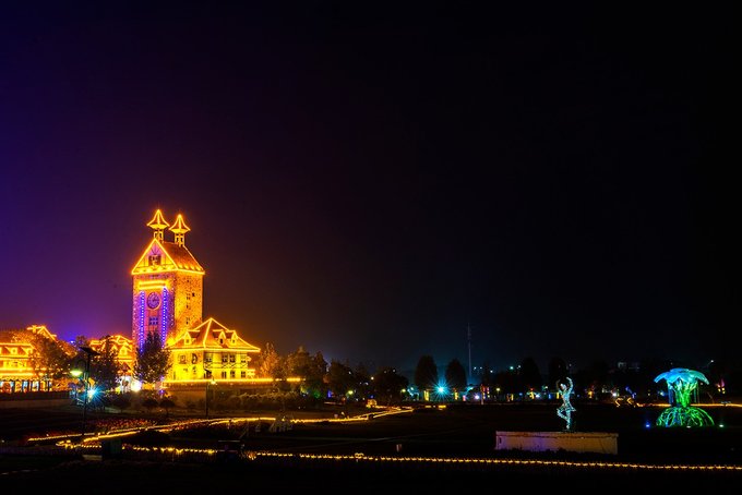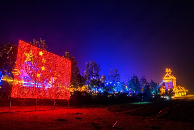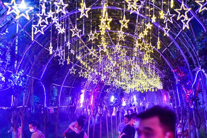 夜幕降临,灯光亮起,千万盏彩柔和的灯光一排排一串串,如星空般温馨璨灿。夜晚的花博汇和白天相比更多了几分如梦似幻,也更多几分静谧。